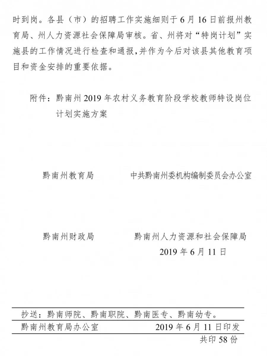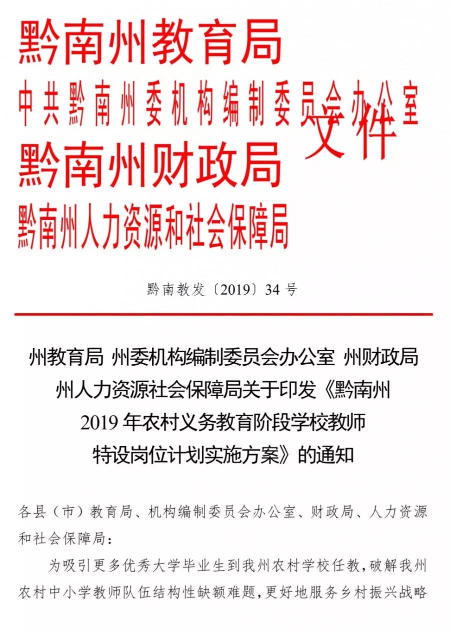 為進一步加強我州農(nóng)村教師隊伍建設(shè),充實農(nóng)村學(xué)校師資力量,提升農(nóng)村教育質(zhì)量,根據(jù)《省教育廳省委機構(gòu)編制委員會辦公室省財政廳省人力資源和社會保障廳關(guān)于印發(fā)<貴州省2019年農(nóng)村義務(wù)教育階段學(xué)校教師特設(shè)崗位計劃實施方案>的通知》(黔教師發(fā)〔2019〕74號)精神,結(jié)合我州實際,制定本方案。