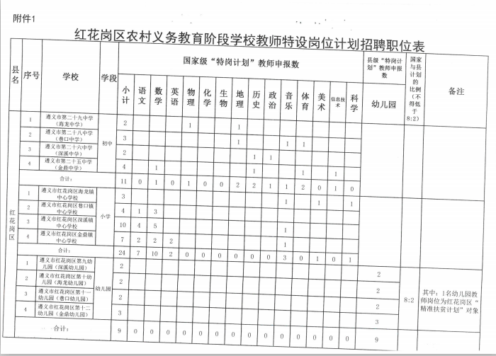 紅花崗區(qū)2019年農村義務教育階段學校特設崗位計劃教師崗位分配表