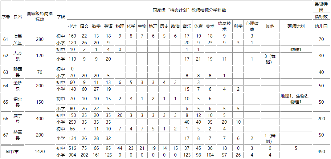 2. 大方縣2019年農村義務階段學校教師特設崗位計劃表